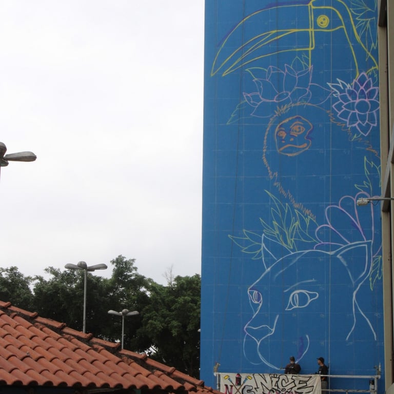 A empena “Fauna e Flora” nasce como um diálogo direto com o território. Localizada no CEU Pera Marmelo, na região do Pico do Jaraguá, a obra se conecta com um dos últimos grandes remanescentes de Mata Atlântica da cidade de São Paulo — um bioma rico, diverso e, ao mesmo tempo, constantemente ameaçado.